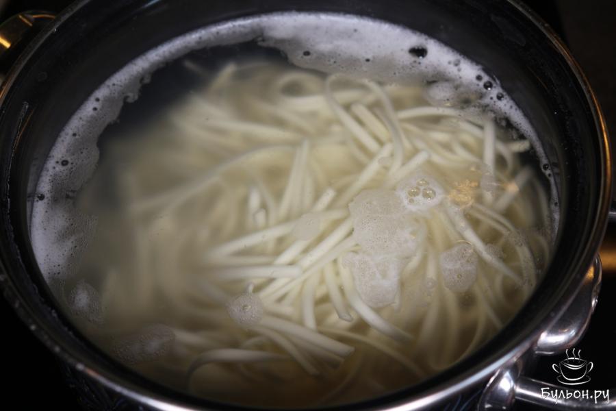 7. В то время как овощи готовятся на сковороде, отварим лапшу. Ее варим в подсоленной воде, как указано на упаковке производителя. Время варки отличается, так как лапша разная по размеру. Уже сваренную лапшу откидываем на дуршлаг, даем пару минут стечь воде.