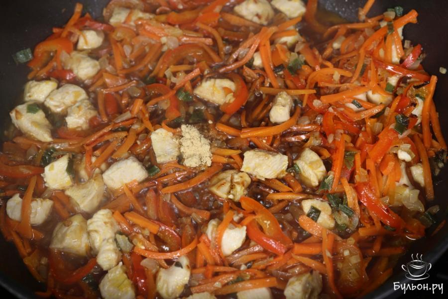 6. Как только это произошло, вливаем воду и соевый соус, сверху посыпаем все молотым имбирем, после чего перемешиваем овощи с курицей. Далее тушим все под крышкой. Готовим блюдо пока овощи и кура не станут мягкими, а соус не загустеет.