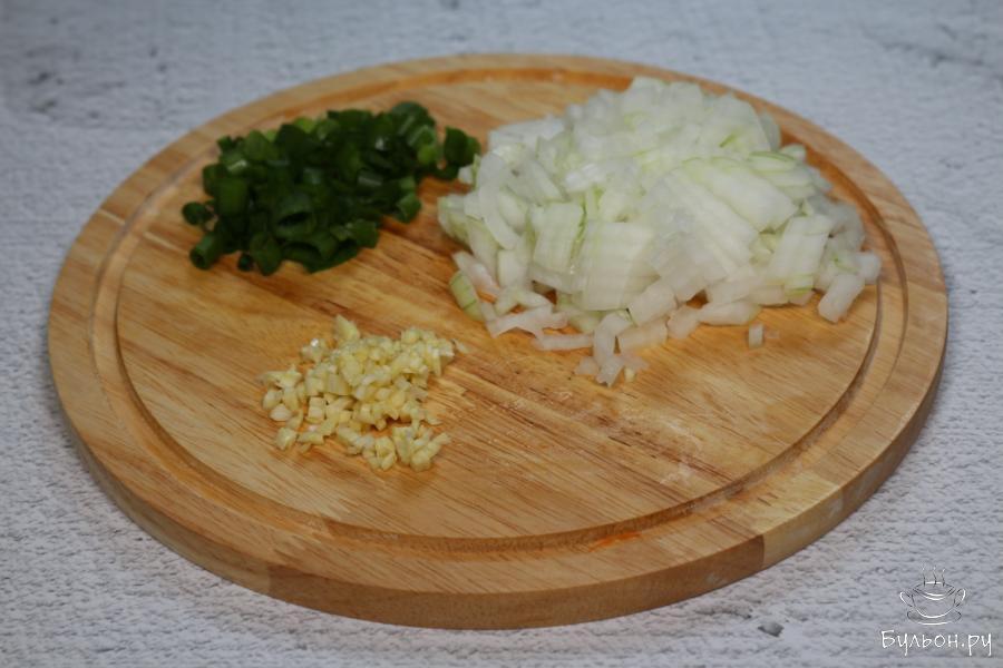 3. Лук очистим, после чего порубим его на мелкие кубики. Зеленый лук нарежем некрупными колечками. Дольку чеснока можно измельчить двумя способами: либо мелко рубим, либо измельчаем с помощью чеснокодавки.