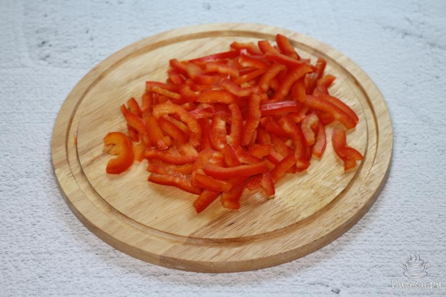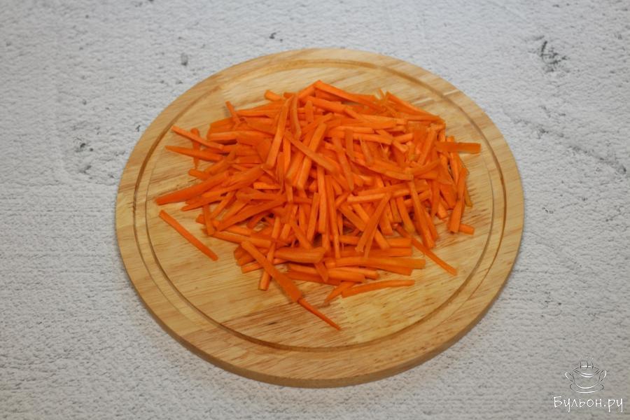 1. Вымоем куру и овощи. Куру промокнем полотенцами и положим на доску или в тарелку и отставим ненадолго в сторону. Займемся овощами. Очистим их, удалим все ненужное, плодоножку и семена у перца. Морковь нашинкуем соломкой. Быстрее и удобнее это будет сделать с помощью спец. инструмента, слайсера.
