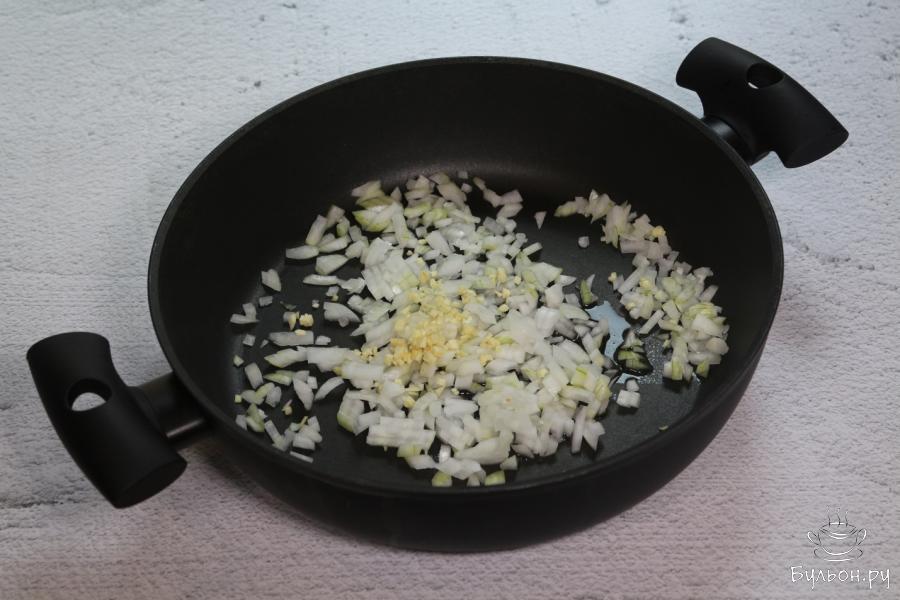 5. Берем сковороду с толстым дном, вливаем немного масла и выкладываем лук с чесноком. Помешивая, жарим их до легкого золотистого цвета. Затем добавляем морковь, болгарский перец, зеленый лук и куру. Продолжаем жарить и время от времени мешать. Готовим все до того, как продукты начнут подрумяниваться.