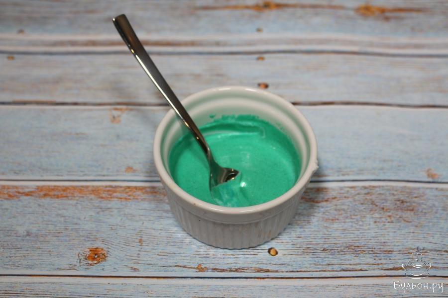 5. Готовый айсинг раскладываем в такое количество емкостей, сколько будет цветов. Добавляем в каждую емкость несколько капель красителя и перемешиваем, чтобы получить однородный цвет, без разводов.