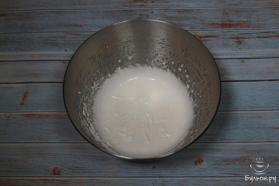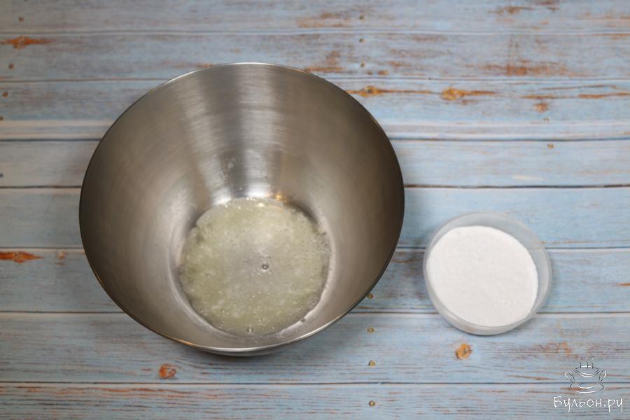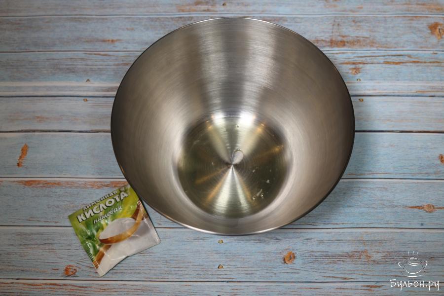 2. Берем глубокую емкость, в которую выкладываем яичный белок, добавляем немного лимонной кислоты. Миксером смешиваем их буквально несколько секунд.