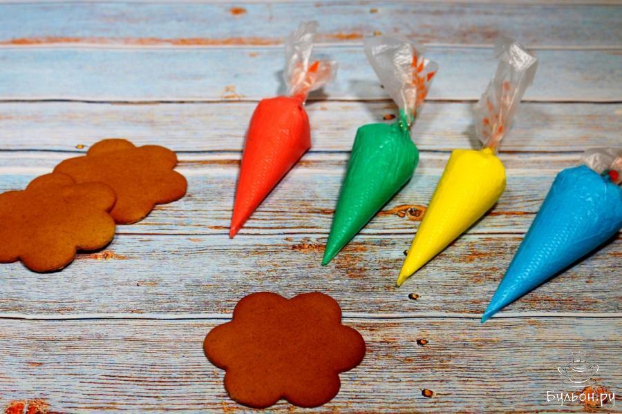 6. С помощью чайной ложки перекладываем цветной айсинг по кондитерским пакетикам, туго затягиваем пакетики скотчем и приступаем к рисованию на пряниках.