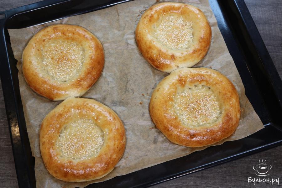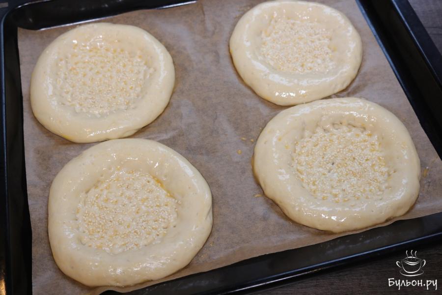 6. Лепешки кладем на бумагу для выпечки, выложенную на противень. Смазываем их взбитым яйцом и посыпаем кунжутом их центр. Ставим в духовку для расстойки. В духовке лучше включить свет, чтобы температура в ней была чуть выше. Оставляем лепешки в духовке на 15 минут.