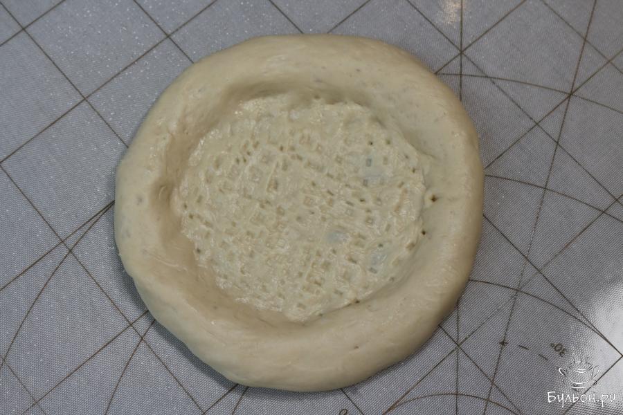 5. Кладем заготовку, начинаем формировать лепешку. Лепим только руками. Придавливаем тесто, смещая его от центра в разные стороны, оставляя лепешку круглой с бортиками по всей окружности. Так лепим все лепешки, убирая их под пленку. В центре лепешек делаем проколы вилкой или молотком для отбивания.