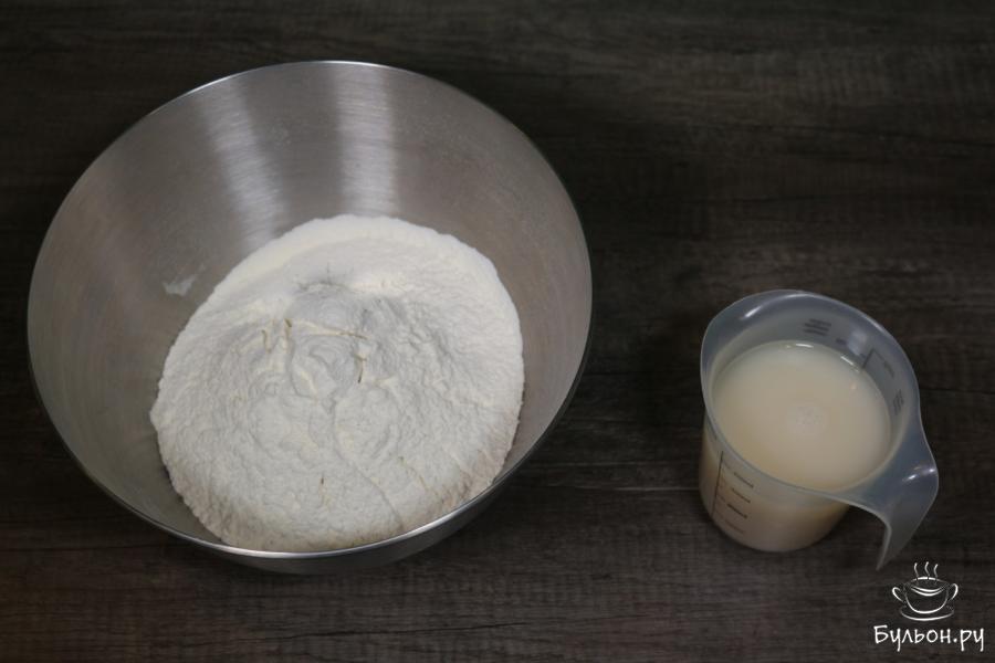 2. В емкости тщательно перемешиваем воду с сухими дрожжами, чтобы они вобрали в себя влагу и разошлись, далее вливаем дрожжевую воду в муку с солью. Замешиванием тесто, в начале перемешивая все ингредиенты ложкой, а когда тесто начнет формироваться приступаем к работе по вымешиванию теста руками.