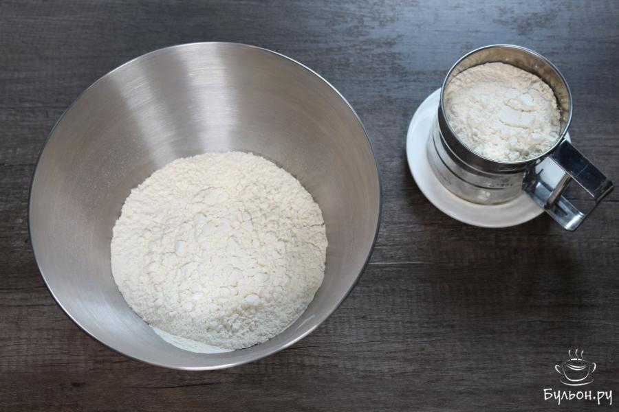 1. Берем большую глубокую емкость. В нее просеиваем всю пшеничную муку, добавляем соль и смешиваем ингредиенты. Соль должна равномерно быть распределена по всей муке.