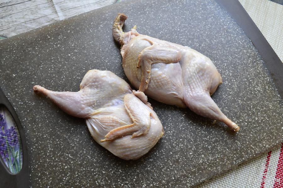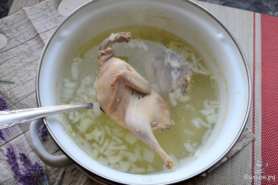 3. Части перепелки разместить в кастрюле, влить холодную чистую воду, довести воду до кипения, посолить ее по вкусу. Сюда же, добавить мелко порезанный репчатый лук. Варить перепелку 15 мин.