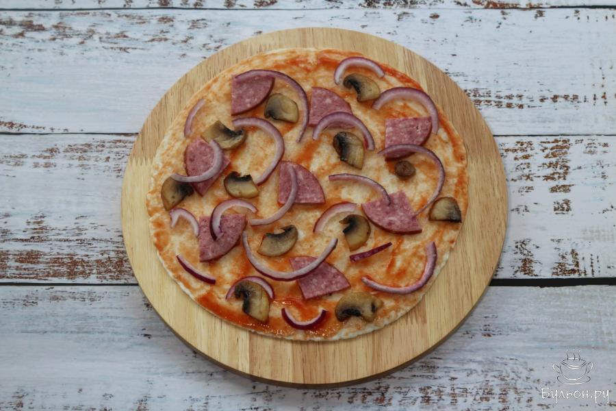 3. На смазанную основу выкладываем тонко нарезанный маленькими кусочками сервелат. Режем шампиньоны тоже маленькими кусочками, а лук перышками. Шампиньоны обжариваем на сковороде с добавлением маленького количества масла буквально минутку. Лук с грибами также выкладываем на тортилью.