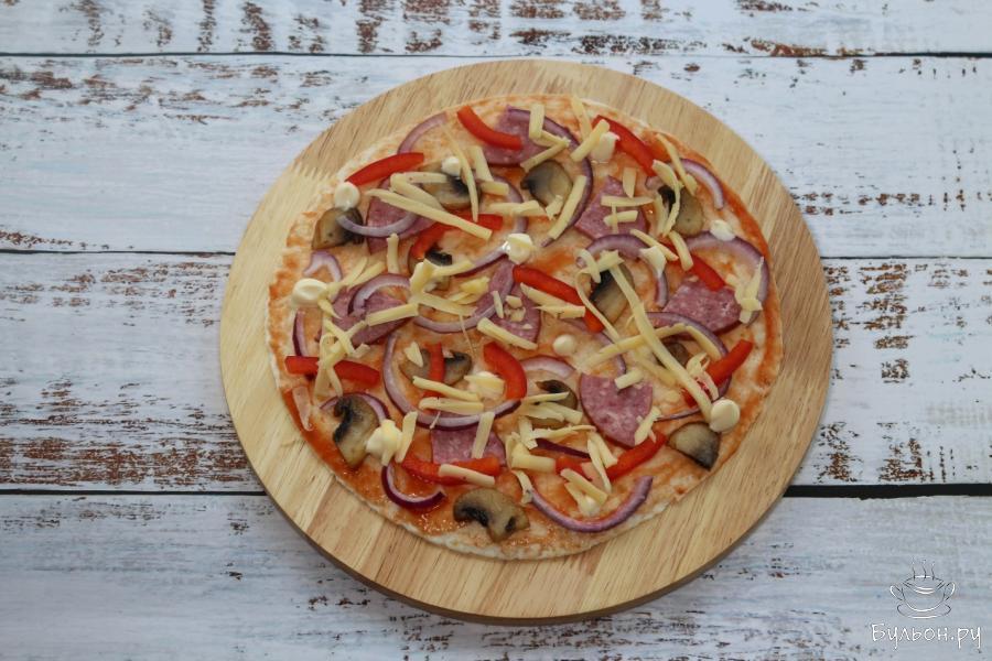 4. Перец чистим и режем тонкими кусочками, которые также укладываем, как и все остальные ингредиенты на пиццу. Добавляем в пиццу немного майонеза и сверху посыпаем тертым сыром. Я терла на крупной терке.