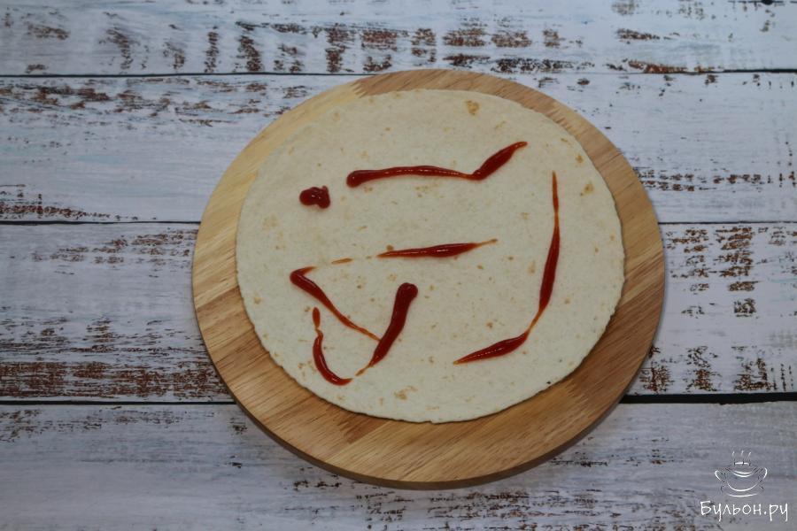 2. Первую тортилью кладем на доску, смазываем ее кетчупом, с помощью ложки равномерно распределяя его по всей поверхности лепешки.