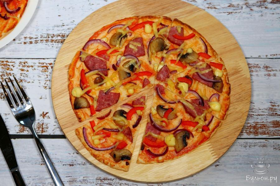 5. Аккуратно берем пиццу и перекладываем ее на противень, застеленный бумагой для выпечки. Собираем вторую пиццу. Ставим противень с пиццами в разогретую до 200 градусов духовку. Печем пиццу в течение 5-7 минут. Готовые пиццы аккуратно вынимаем из духовки. Пиццы порционно нарезаем и подаем к столу.