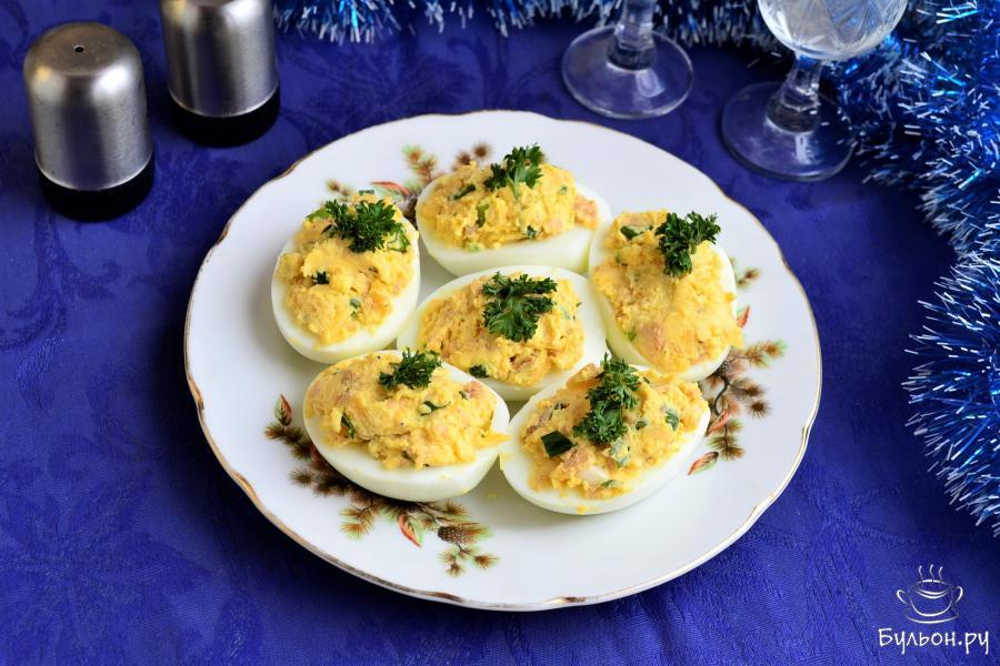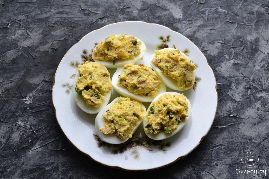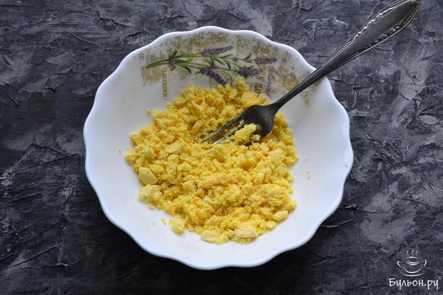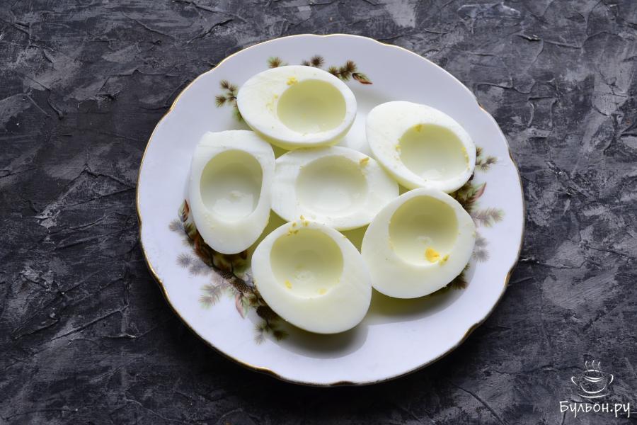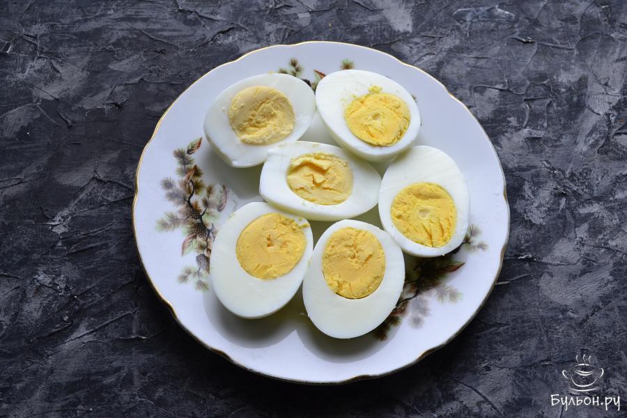 1. Яйца хорошо вымыть и отварить в течение 8-10 мин., почистить от скорлупы, разрезать вдоль на половинки.