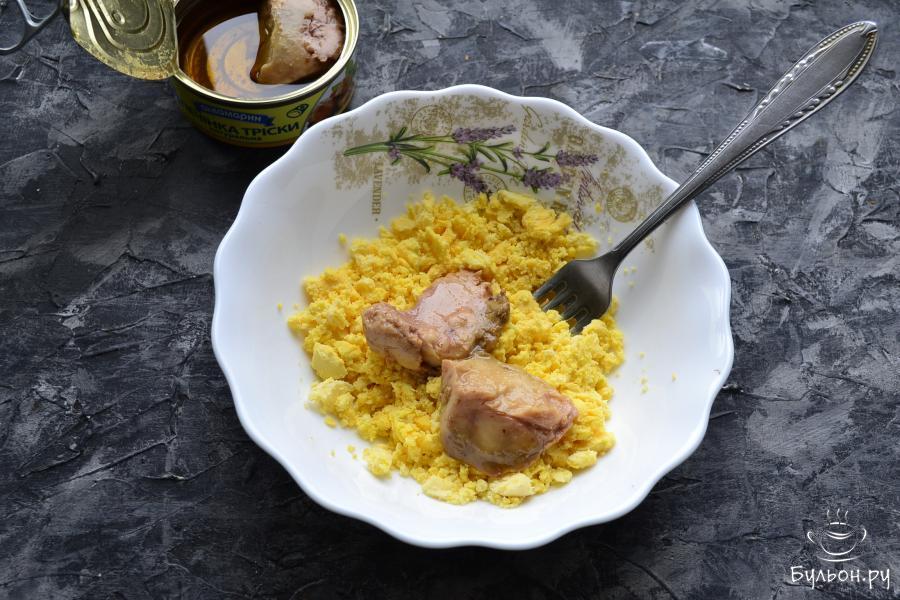 4. Добавить печень трески и немного масла из банки (1-2 ч. л.), тщательно размять ее вместе с желтками.