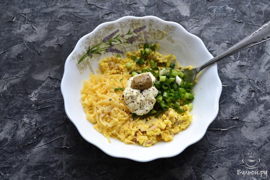 6. Сюда же, добавить майонез, горчицу готовую и черный перец, если понадобится, все немножко посолить.