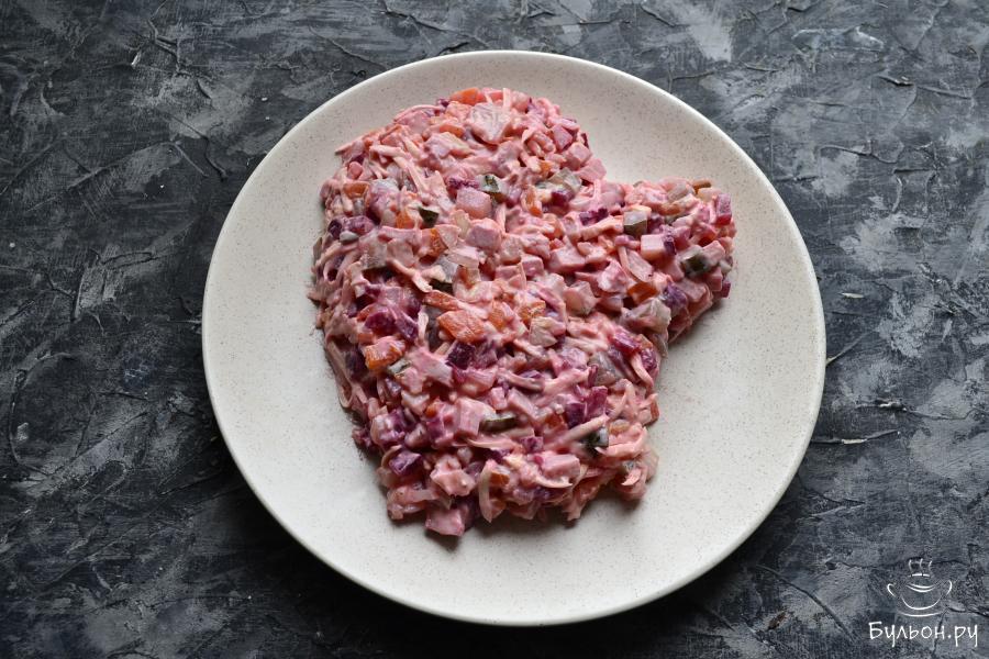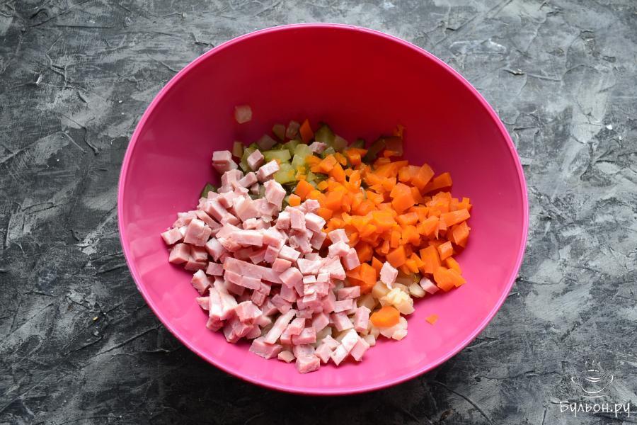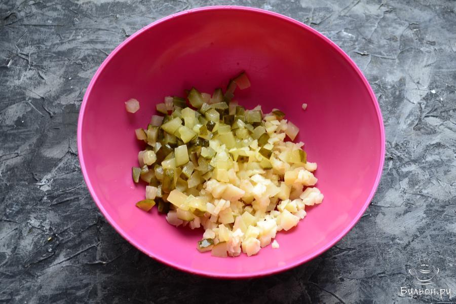 1. Свеклу, морковь, яйца и картофель нужно заранее сварить и очистить. Картофель и маринованный огурчик порезать маленькими кубиками.