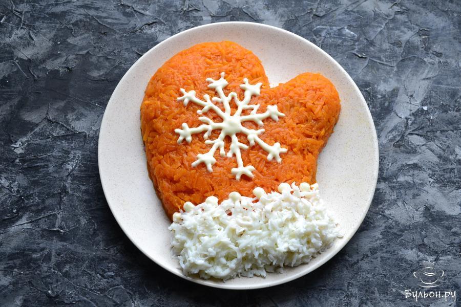8. Белки натереть и выложить их, имитируя опушку на варежке. Майонезом, из кондитерского мешка с обрезанным кончиком, нарисовать на варежке снежинку. Вот и все, красивый, яркий салат готов к подаче на новогодний стол. Приятного аппетита.