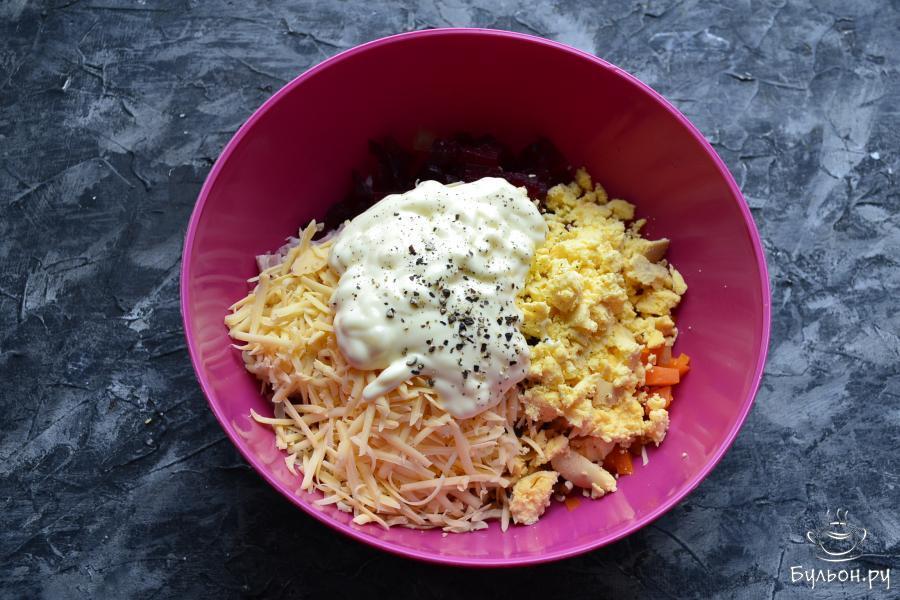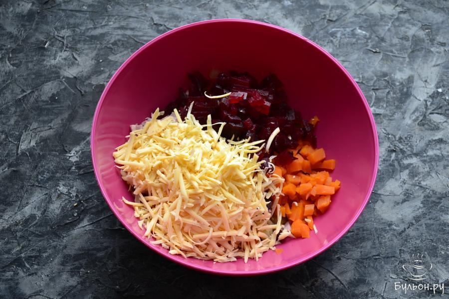3. Сыр натереть, свеклу порезать такими же кубиками, как и остальные продукты. Добавить сыр и свеклу в салат.