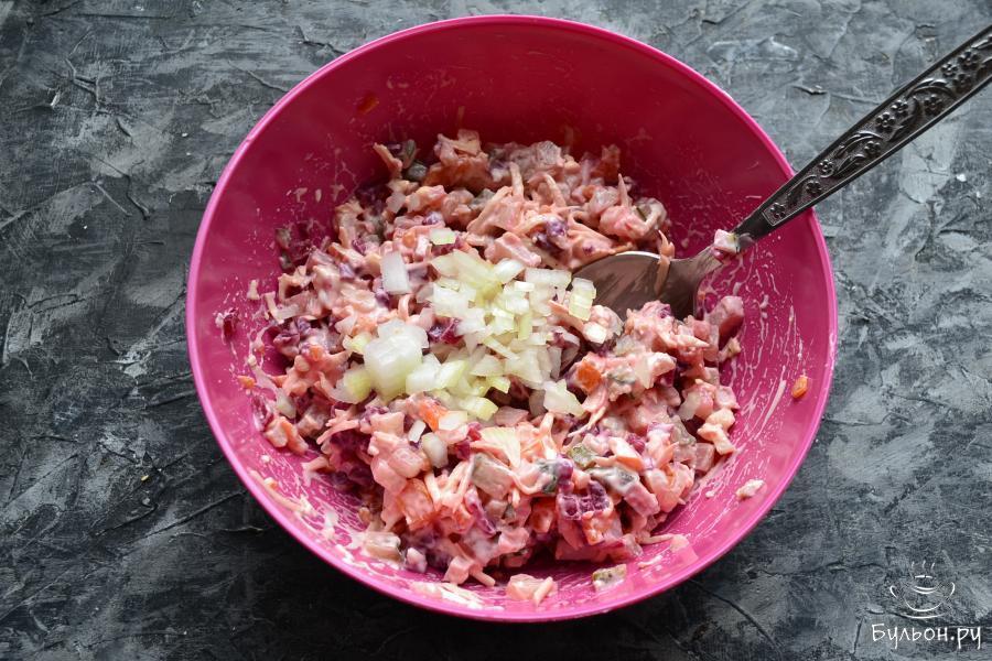 5. Для более острого вкуса добавить в салат мелко порезанный репчатый лук (по-желанию), салат перемешать.