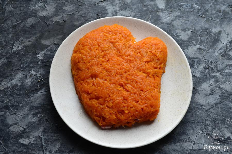 7. Оставшуюся вареную морковку натереть на терке (средней) и полностью, аккуратно, покрыть ею весь салатик.