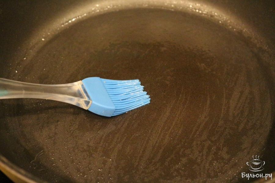 3. Сковороду с толстым дном смазываем небольшим количеством оливкового масла. Это удобнее всего делать, используя силиконовую кисть.