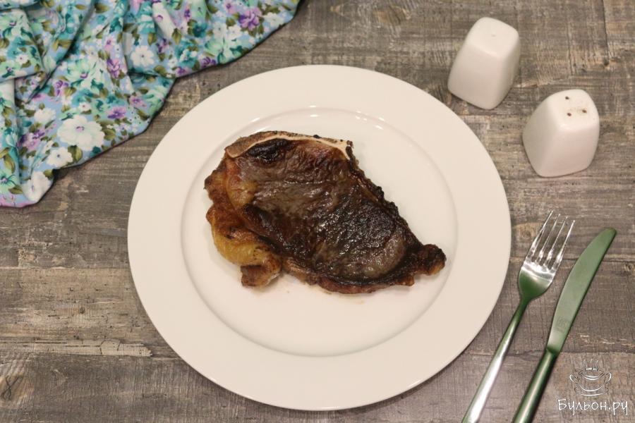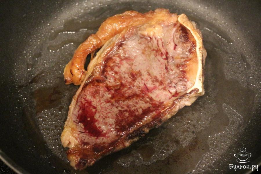 4. Кладем стейк уже на хорошо разогретую сковороду и жарим его с двух сторон до желаемой вами степени прожарки. Я предпочитаю готовить хорошо прожаренные стейки без крови. На это потребуется 6-8 минут в зависимости от мощности вашей плиты.