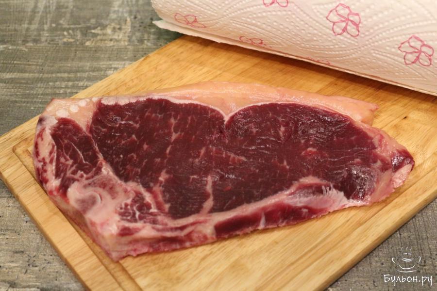 2. Теперь вскрываем упаковку, достаем кусок мяса и убираем со стейка лишнюю влагу. Это удобно сделать, воспользовавшись бумажными полотенцами.