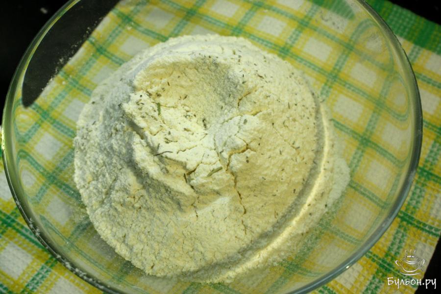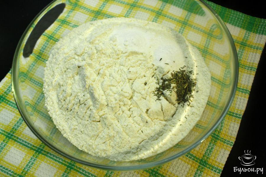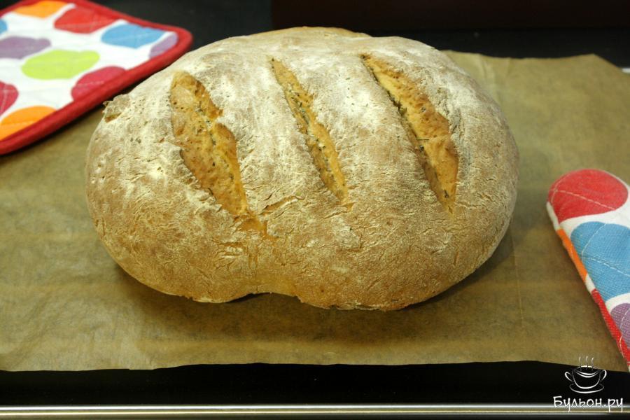 5. Сформировать шар, переложить на противень и слегка приплюснить. Сделать надрезы острым ножом. Припылить слегка мукой и сушеным розмарином.
