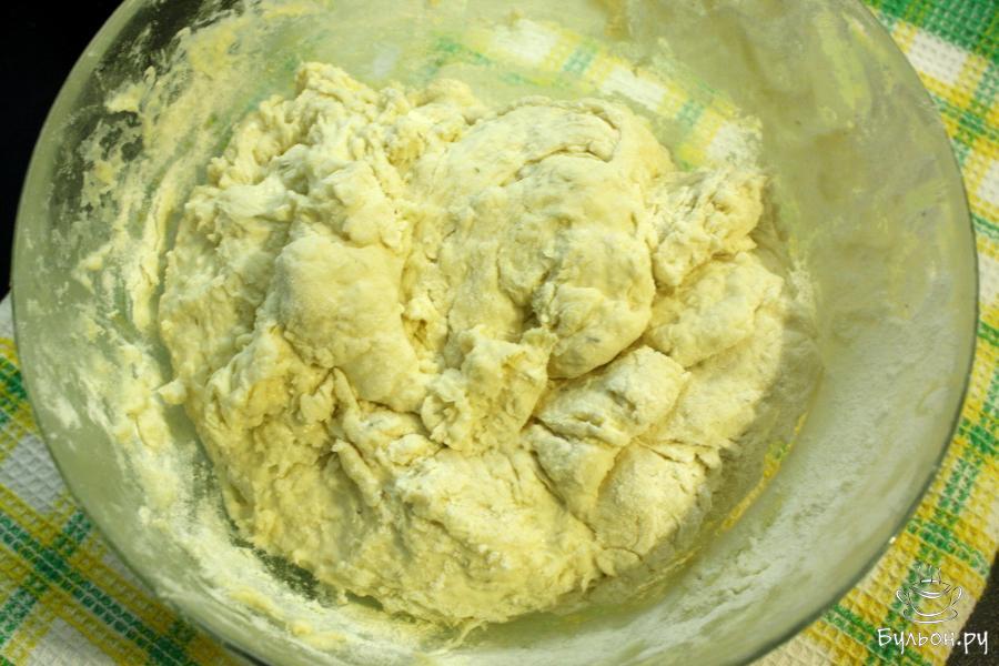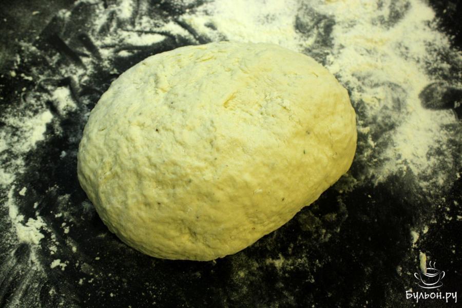 4. Переложить тесто на присыпанную мукой поверхность. Вымесить тесто до однородности, оно должно получиться мягким. При необходимости, добавьте муку или молоко.
