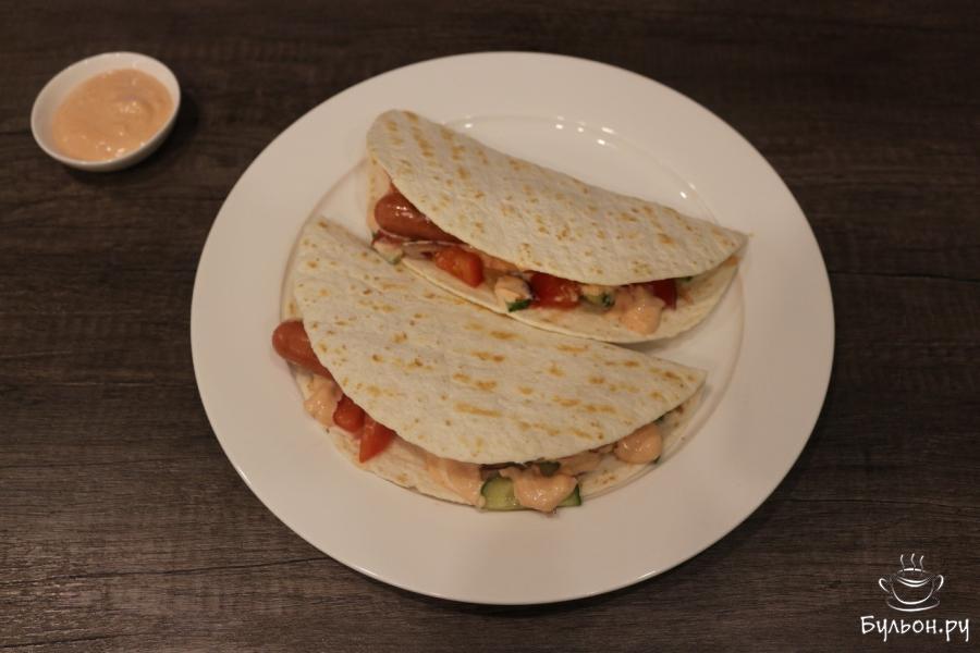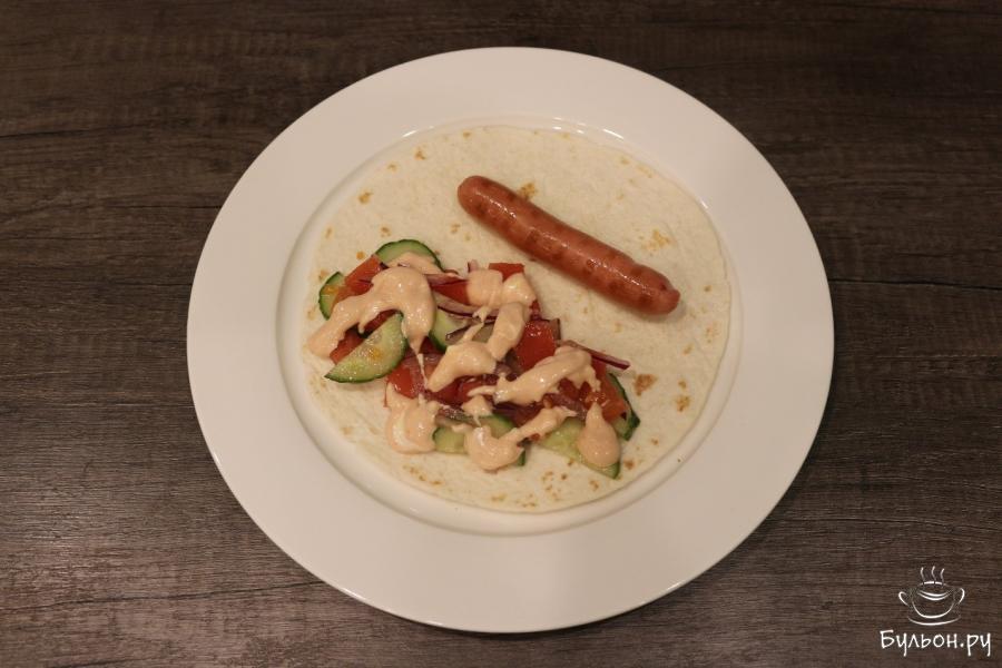 6. Когда все подготовлено, соберем все вместе. Кладем тортилью, на нее выкладываем салат из свежих овощей, сосиску и соус.