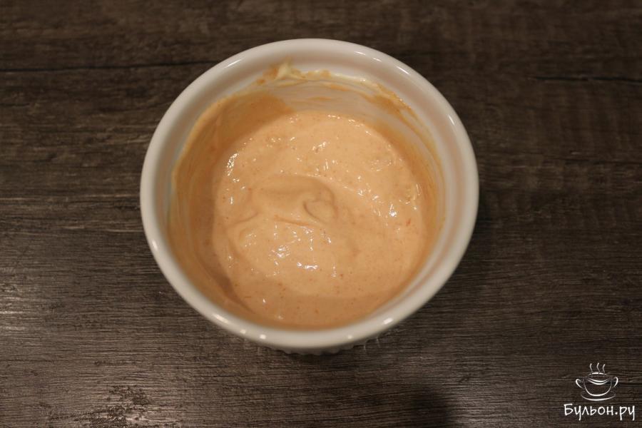 2. Теперь приступаем к приготовлению соуса. В маленькую емкость помещаем майонез, кетчуп и измельченный зубчик чеснока. Перемешиваем все составляющие соуса.
