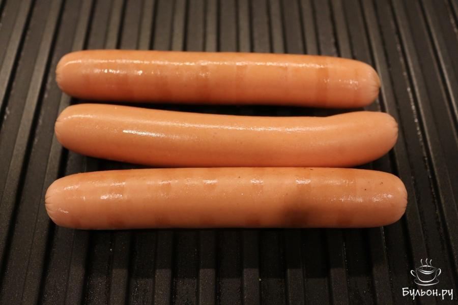 5. Теперь на эту же поверхность выкладываем сосиски. Их также обжариваем до образования полосочек и их готовности. Я жарила примерно 5 минут.