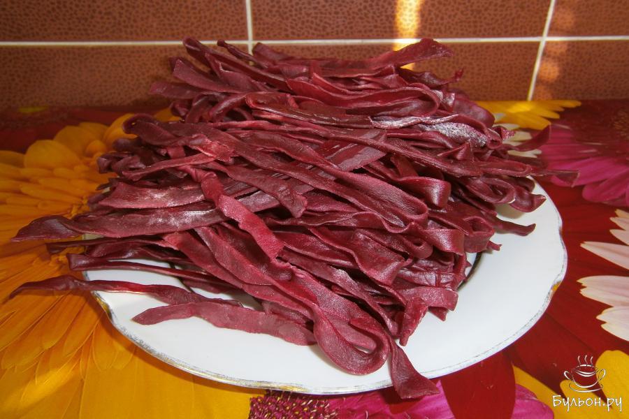 9. Лапша с соком свеклы. Одну свеклу отварить до готовности и натереть на мелкой терке. Добавить 2 столовые ложки натертой свеклы в тесто и перемешать.
