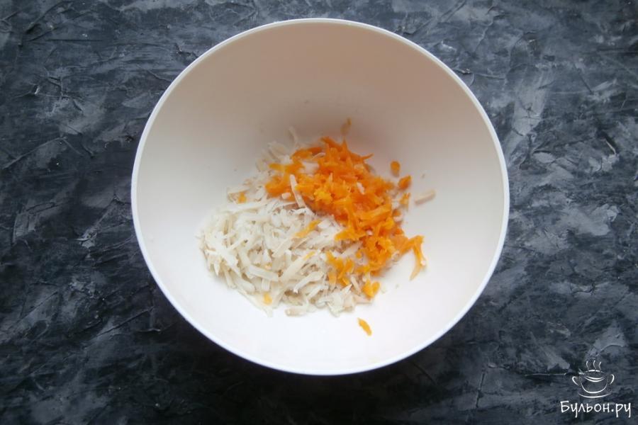 1. Отварить заранее картошку, морковку и яйца, все остудить и почистить. Картофель и половину морковки натереть на терке.