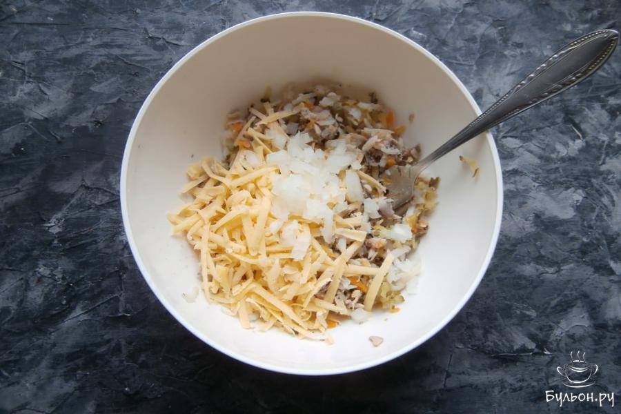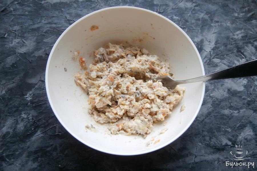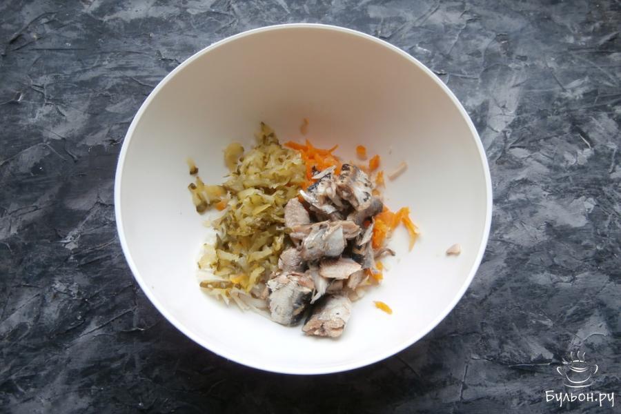2. Добавить консервированную сардину без масла и натертый, отжатый от жидкости маринованный огурчик.