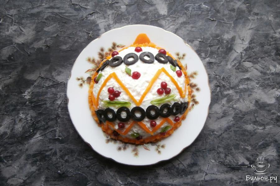 9. Салат осталось только украсить: создать узор полосочками оставшейся морковки, колечками оливок, ягодками красной смородины и зеленым луком или другой зеленью.