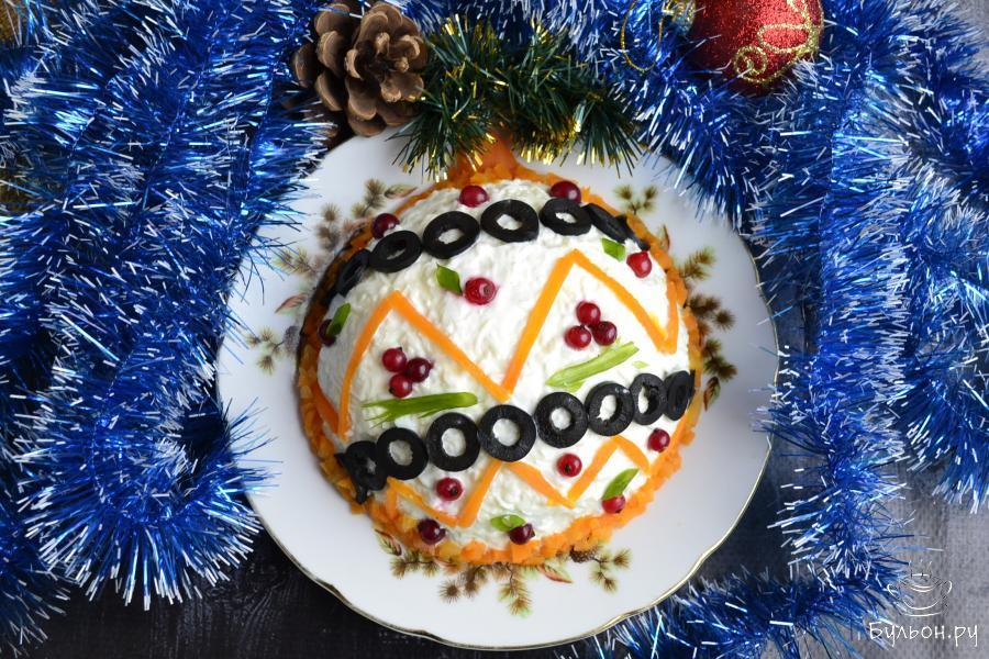 К праздничному новогоднему столу всегда хочется приготовить необычные, яркие и красивые блюда. И таких блюд существует множество - салаты, закуски, выпечка и т. д. Рецептом одного яркого и интересного тематического салата я хочу с вами поделиться. Это салат формируется в виде новогодней елочной игрушки-шара и выглядит потрясающе. К тому же салатик очень вкусный, хотя и состоит из самых обычных продуктов. Приготовьте такой салат на новогодний стол и комплименты от родных и гостей вам обеспечены.
