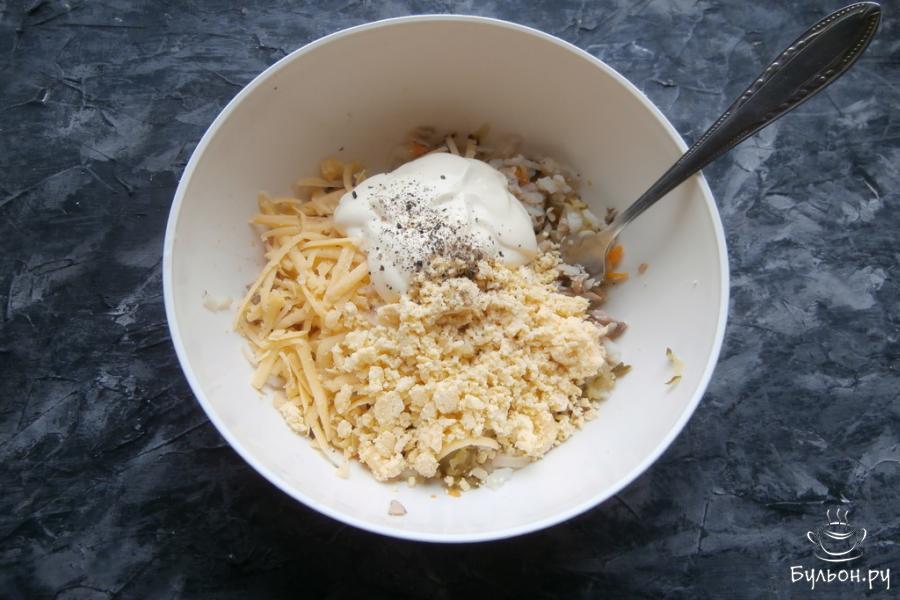 4. Яйца разделить на желтки и белки, желтки натереть и добавить в салат, белки натереть и пока отложить. Добавить в салат 2 ст. л. майонеза, соль. Все по вкусу поперчить.