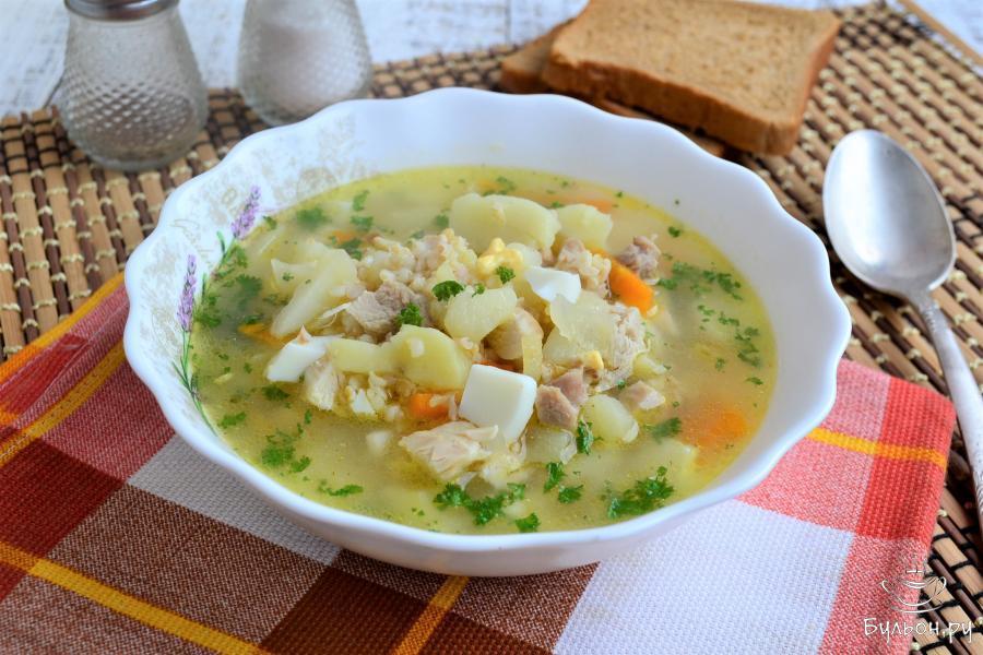 В моей семье не очень любят сложные и навороченные супы, а вот простые, особенно куриные супчики едят с удовольствием. Хочу поделиться с вами рецептом одного из таких куриных супов - с яйцом и пшеничной крупой. Блюдо очень вкусное и сытное, для обеда - самое то. Для бульона можете брать любые части курицы, у меня было бедро. В этом рецепте пшеничная крупа варится отдельно и закладывается в суп уже в конце готовки. Подавать блюдо следует в горячем виде с зеленью. Вкусно, сытно и ароматно, рекомендую.