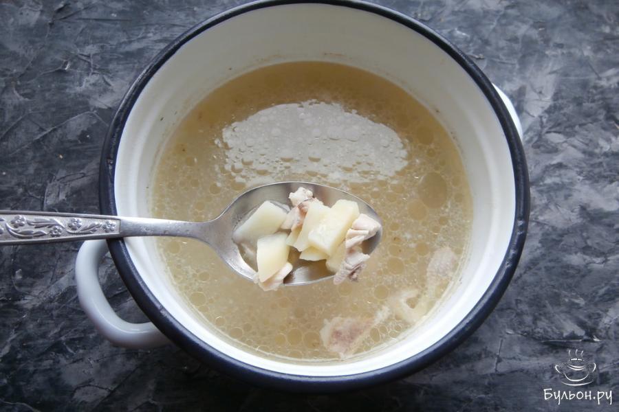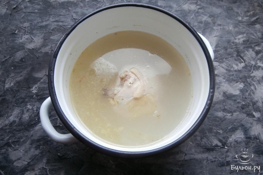 2. Воду посолить по своему вкусу, далее, варить курицу мин. 20-25. Готовое бедрышко вынуть из кастрюли, полностью его остудить.