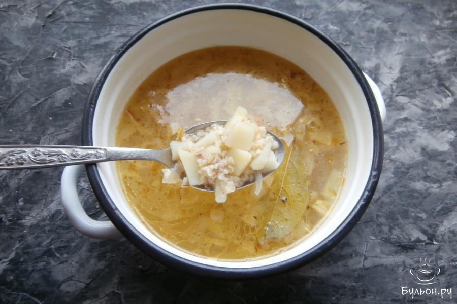 8. Овощи отправить в суп вместе с подготовленной отваренной пшеничной крупой. Сюда же, добавить приправу, лавровый лист и зубчик чеснока, который нужно мелко порезать. Дать супу покипеть минут пять.