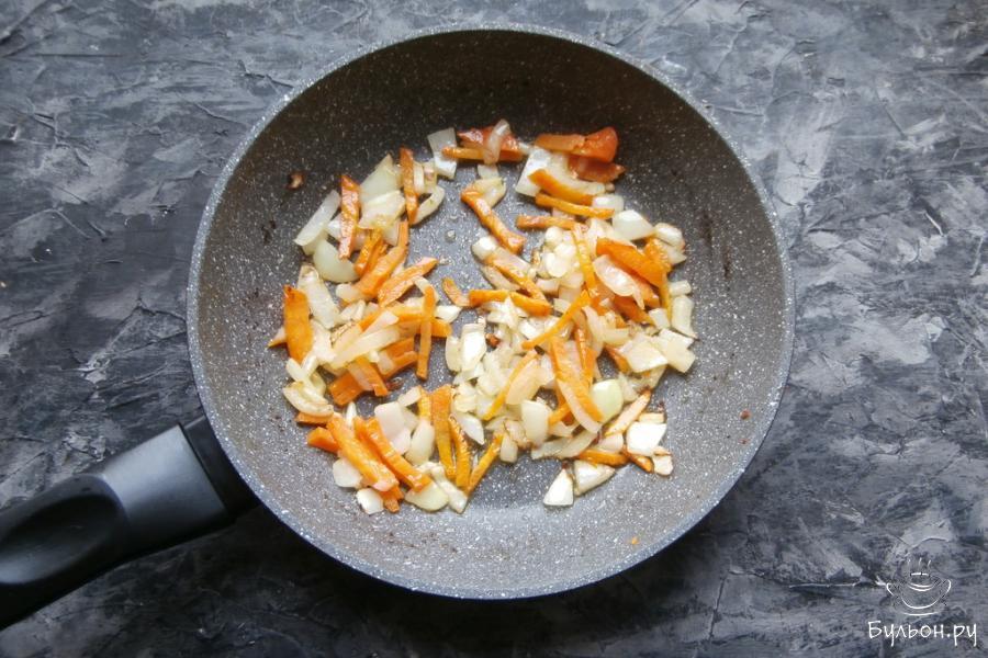 7. Лук и половину моркови порезать произвольно, обжарить все до мягкости на любом, на ваш вкус растительном масле.