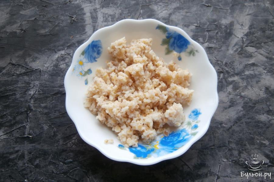 3. Также, предварительно отварить до готовности пшеничную крупу (заливается водой 1:2, на слабом огне варится 20-25 мин.). Крупа не должна превратиться в кашу, должна остаться рассыпчатой. Яйца тоже заранее сварить и очистить.