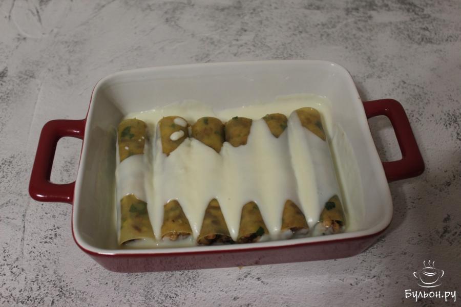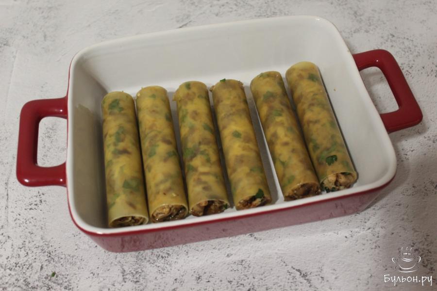 6. Берем каннеллони и наполняем их достаточно плотно получившейся начинкой. Наполненные трубочки выкладываем в смазанную рафинированным маслом форму для запекания.
