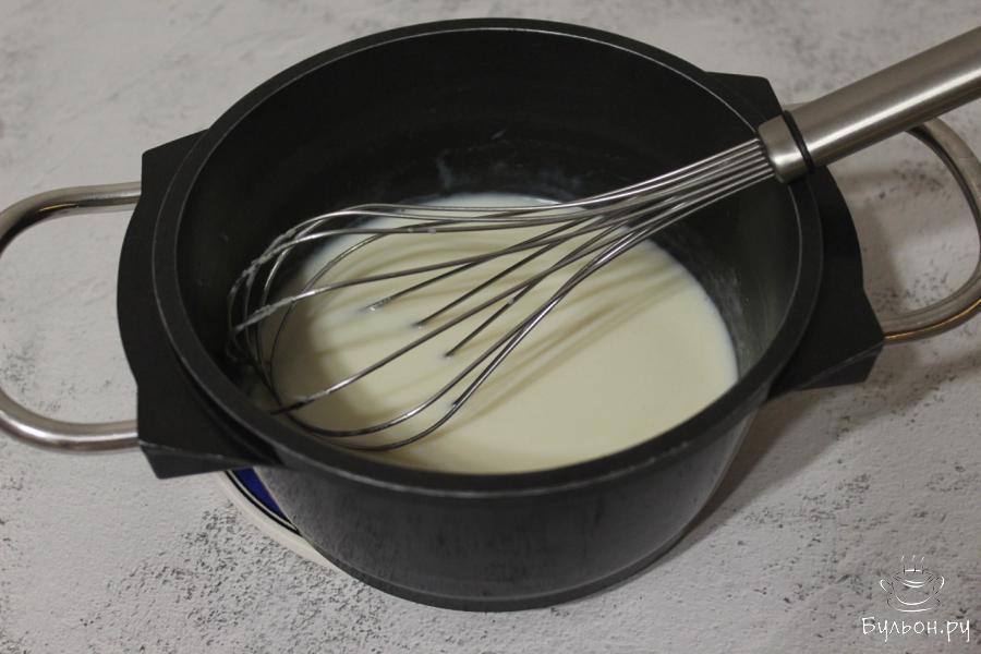 7. Теперь дело дошло до соуса бешамель. Кусочек сливочного масла растапливаем, в нем слегка обжариваем пшеничную муку и струйкой вливаем молочко. Тщательно вымешиваем, чтобы не было комков. В процессе помешивания добавляем мускатный орех, перец и соль.