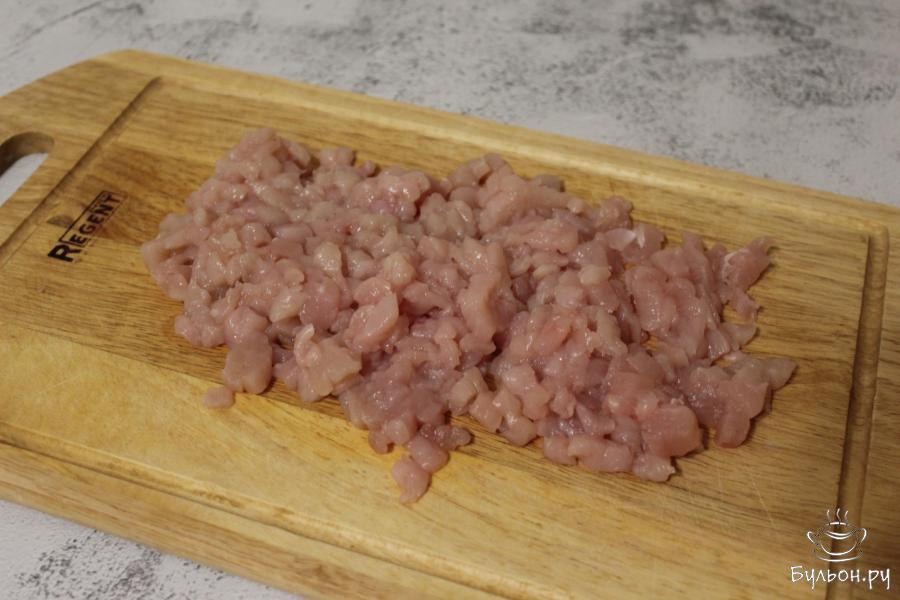 1. Очищенное от пленочек и промытое филе курицы мелко нарезаем. При желании можно перемолотить или измельчить в блендере. Но мне больше нравится филе, нарезанное ножом.