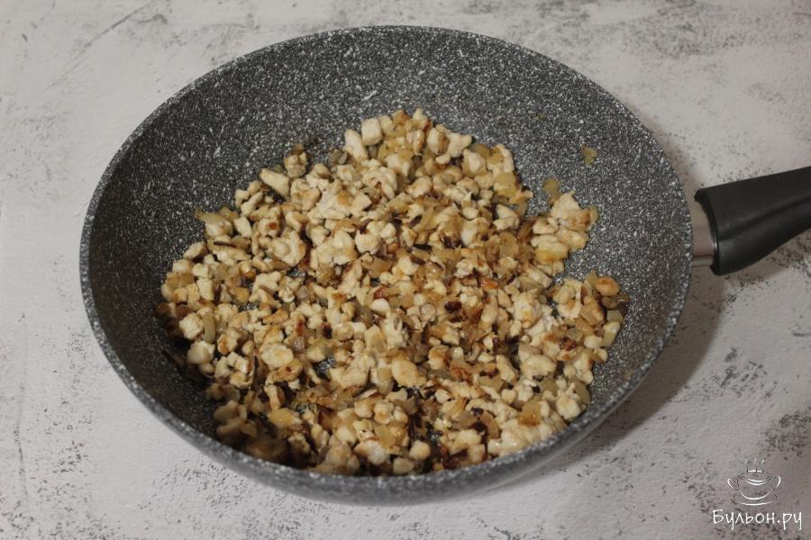 5. Когда начинка будет готова, снимаем сковороду с огня и даем немного остыть. В это время натираем сыр и измельчаем петрушку. В остывшую начинку добавляем зелень с сыром, перчим, солим и перемешиваем.