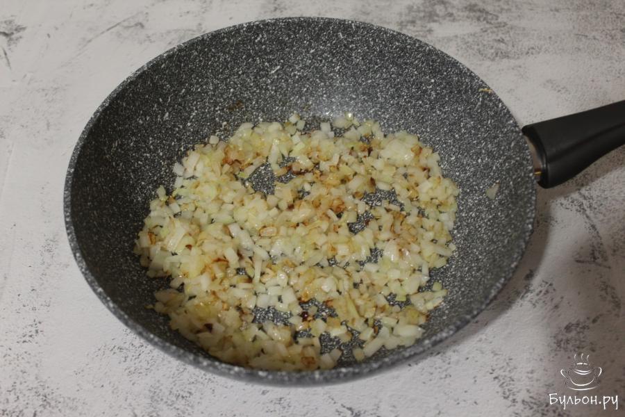 2. Очищенную луковичку нарезаем кубиками и обжариваем на рафинированном масле до мягкого состояния, после чего еще немного обжариваем чтобы лучок немного подрумянился.