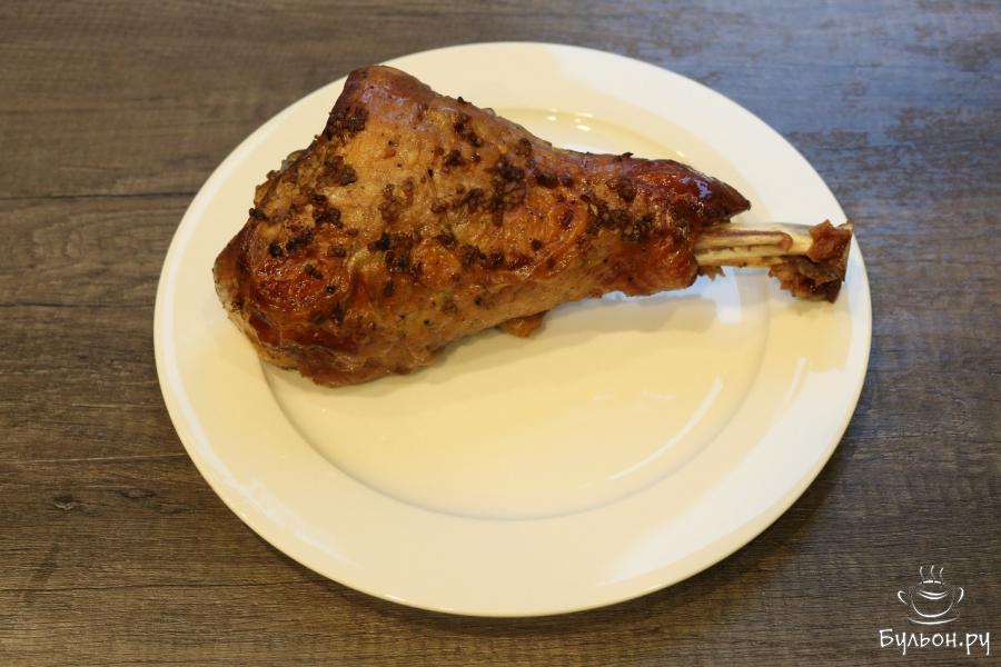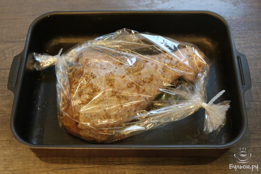6. Замаринованную ножку кладем в специальный рукав, предназначенный для запекания. С двух сторон закрепляем края и, чтобы поступал воздух, сделаем несколько надрезов в пакете. Запекаем голень при двухстах градусах две трети часа, потом еще 50 минут, но уже при 160 градусах.